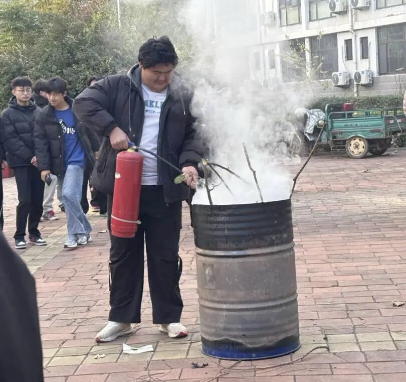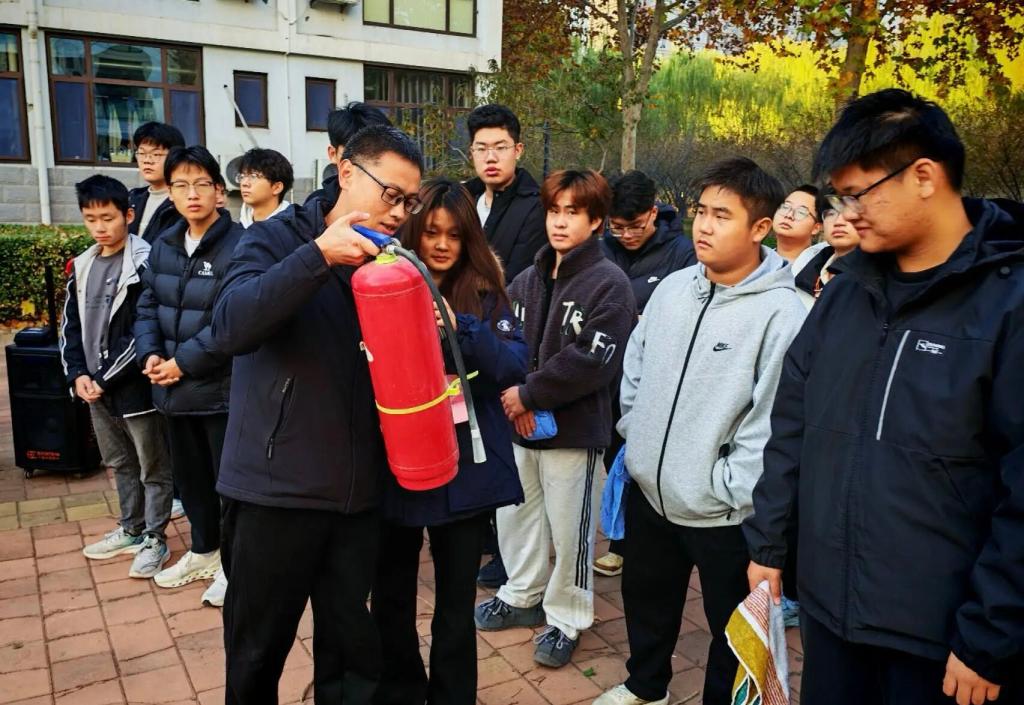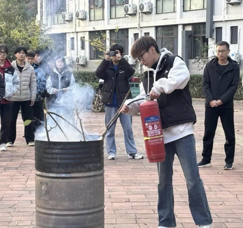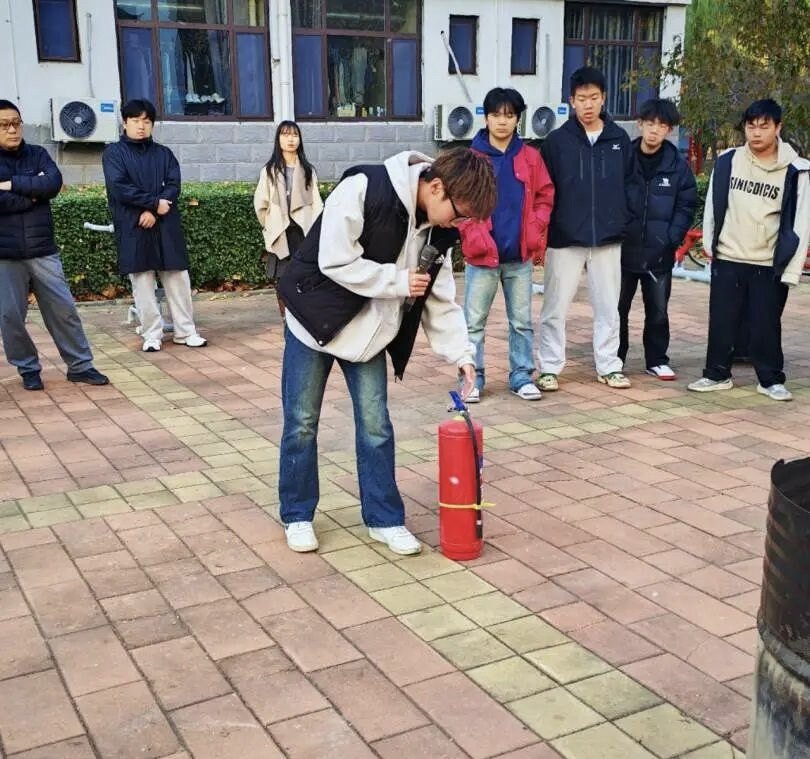 全体师生集结完毕后,由王文静和高俊浩两位同学为大家讲解消防安全知识及灭火器的使用方式,随后,保卫处艾老师作补充发言,并且结合学院宿舍楼多电器、多火灾的特点,重点讲解火灾初期扑救、灭火器使用及特殊场景应急处置要点,使同学们熟练掌握“提、拔、握、压”灭火技巧,并邀请同学们上前亲身体验。