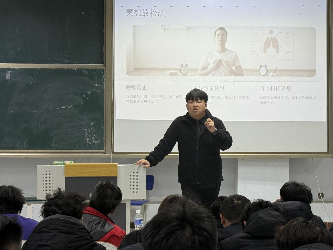 活动围绕压力产生、影响及释放方法展开。现场通过案例分享,剖析了经济负担、学业竞争等常见压力源,以及压力对身心的潜在影响。此外,还讲解了冥想放松、积极暗示等实用减压技巧,引导学生树立正确的压力应对观念。