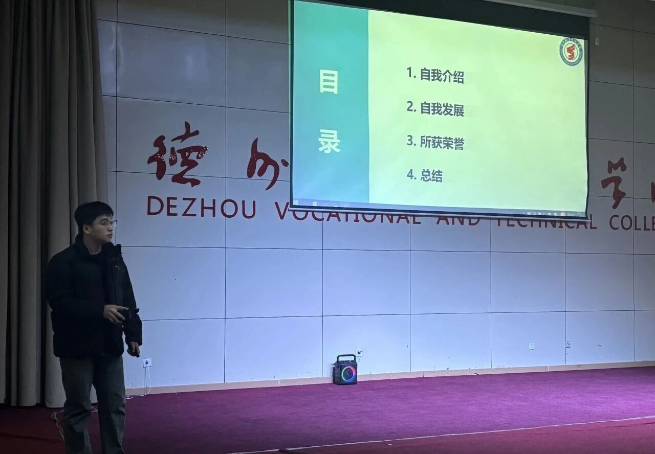 为发挥国家奖学金获得者的榜样引领作用,分享成长经验,激发学子奋进动力,12月9日,德州职业技术学院“我与国奖的那些故事”主题宣讲会顺利举行。绿色能源学院24级电气自动化技术二班班长、学生会组织部部长林凡运同学作为国奖获得者代表,以自身经历为蓝本,为现场师生带来了一场干货满满、催人奋进的分享。