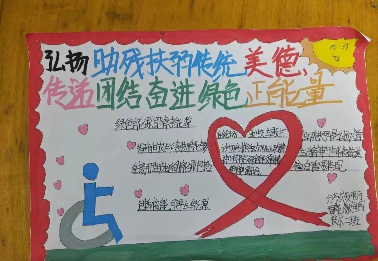 为深入践行助残扶弱的中华传统美德,让“团结互助、关爱残障”的理念在校园落地生根,近日,我院精心策划并开展“自强+绿能”主题手抄报制作活动。活动聚焦残障人士自强不息的精神内核,将助残爱心与绿色能源知识相融合,引导学生用笔墨传递关怀,用创意诠释担当,让温暖与力量在校园中层层传递。