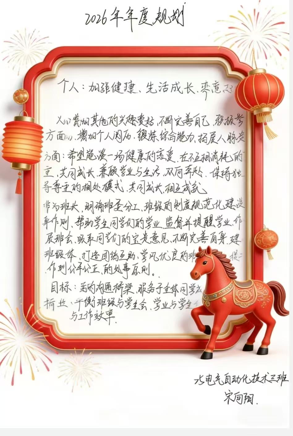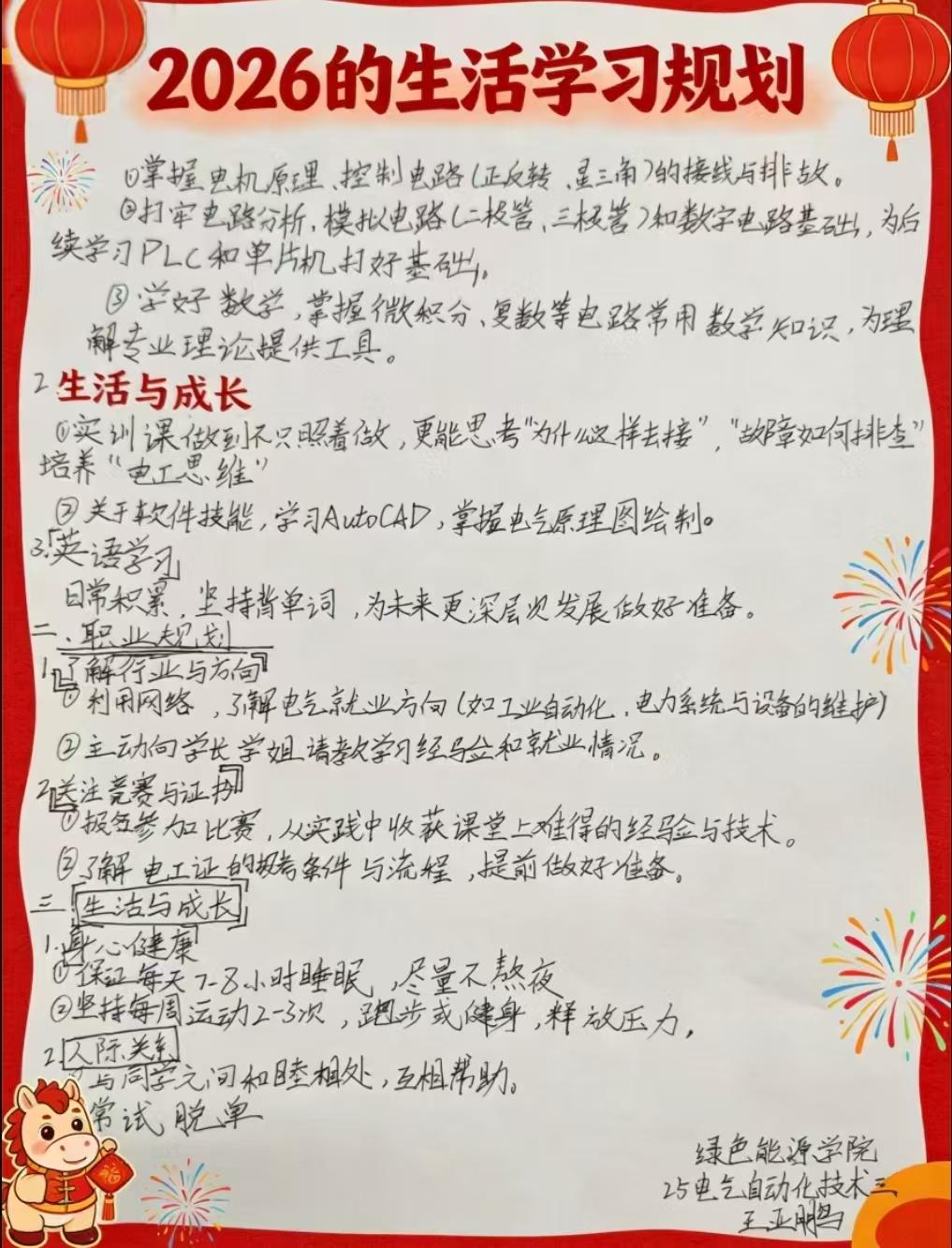 时光悄然流转,新的一年已然启程。站在岁序更替的节点上,绿色能源学院的学子们怀揣着对专业的热忱与对未来的期许,纷纷执笔书写新年规划,以清晰的目标锚定成长方向,用扎实的行动奔赴绿色未来。