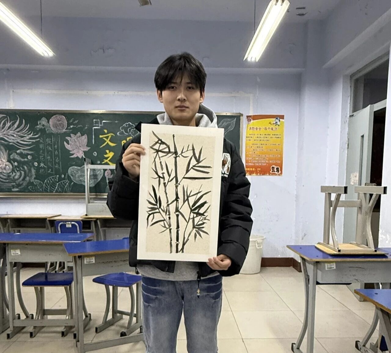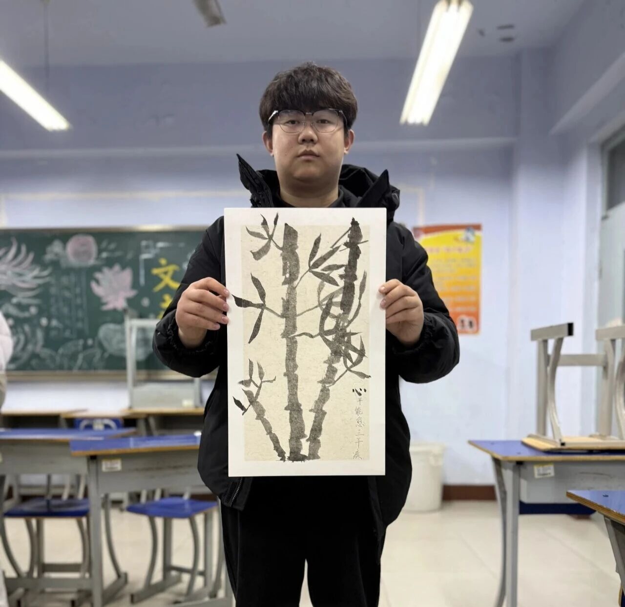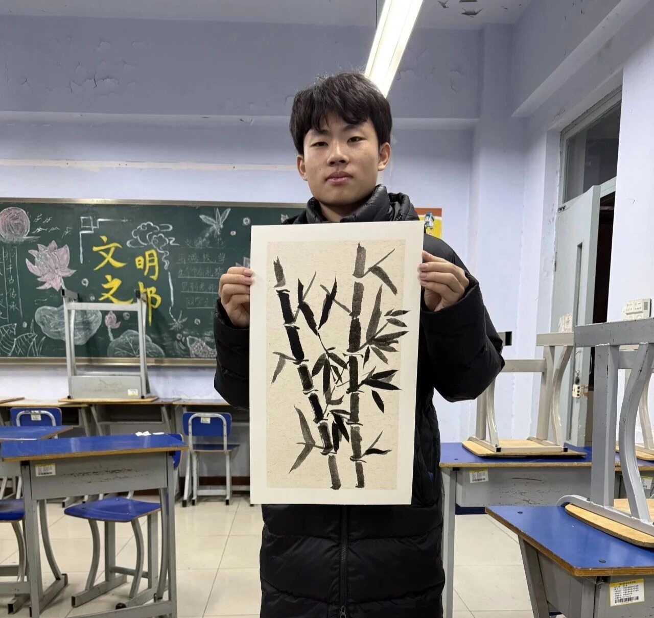 在实践环节,同学们在孙老师的指导下,从握笔姿势开始学起,逐步尝试画竹竿、竹节、竹枝和竹叶。起初,不少同学对自己能否画好表示怀疑,但在老师的耐心指导和鼓励下,大家逐渐掌握了基本技巧。