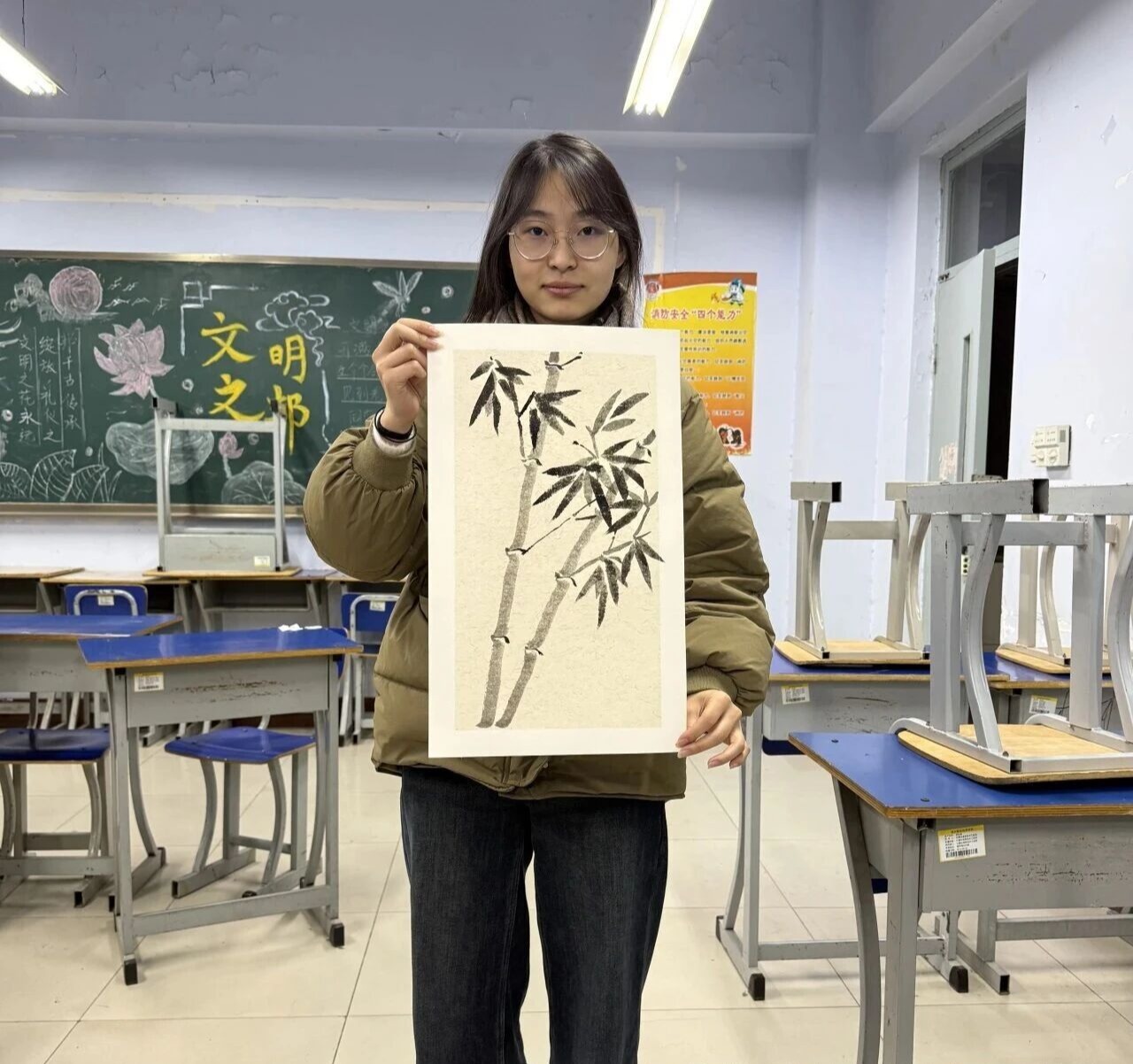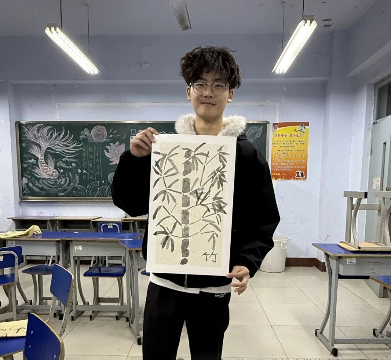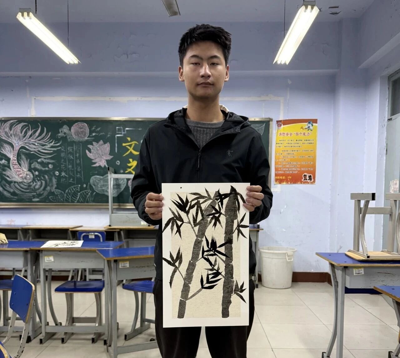 在实践环节,同学们在孙老师的指导下,从握笔姿势开始学起,逐步尝试画竹竿、竹节、竹枝和竹叶。起初,不少同学对自己能否画好表示怀疑,但在老师的耐心指导和鼓励下,大家逐渐掌握了基本技巧。
