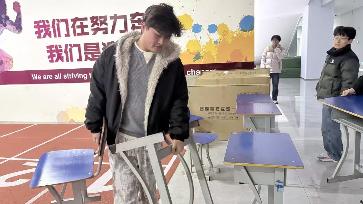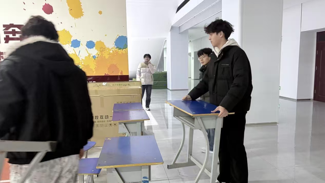 赛前筹备阶段,学院学子迅速集结、分工协作。面对场馆内的桌椅搬运任务,同学们两两配合、高效行动,有条不紊地完成器材转运与摆放,确保场地布置规范有序,为比赛的顺利开展筑牢后勤基础。比赛结束后,学子们又第一时间整理归置桌椅,让场馆恢复整洁。