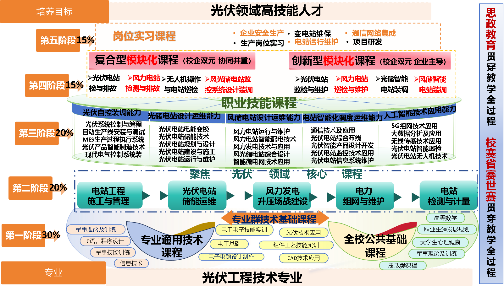 本专业培养理想信念坚定、德智体美劳全面发展,掌握光伏发电系统规划与设计、建设与施工管理、运行与维护等核心能力的高素质技术技能人才。核心课程包括供配电技术应用、光伏电站安装与调试、光伏电站规划与设计、光伏电站建设与施工、光伏电站运行与维护等。